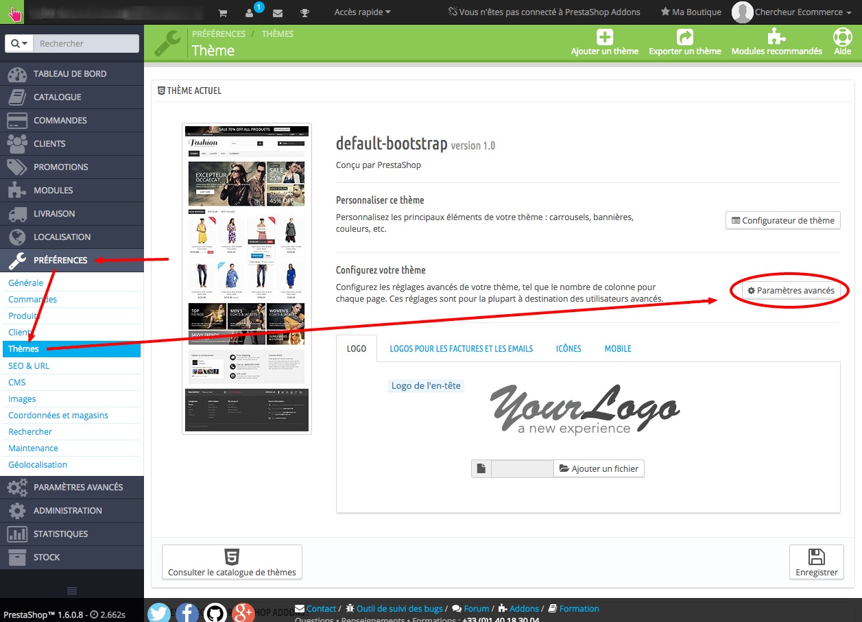 PrestaShop propose dans son administration une configuration par thème pour choisir d’afficher ou non les colonnes sur les différentes pages du site. Le réglage se situe dans Préférences > Thèmes > Paramètres avancés (tout à droite de votre écran voir ci dessous).