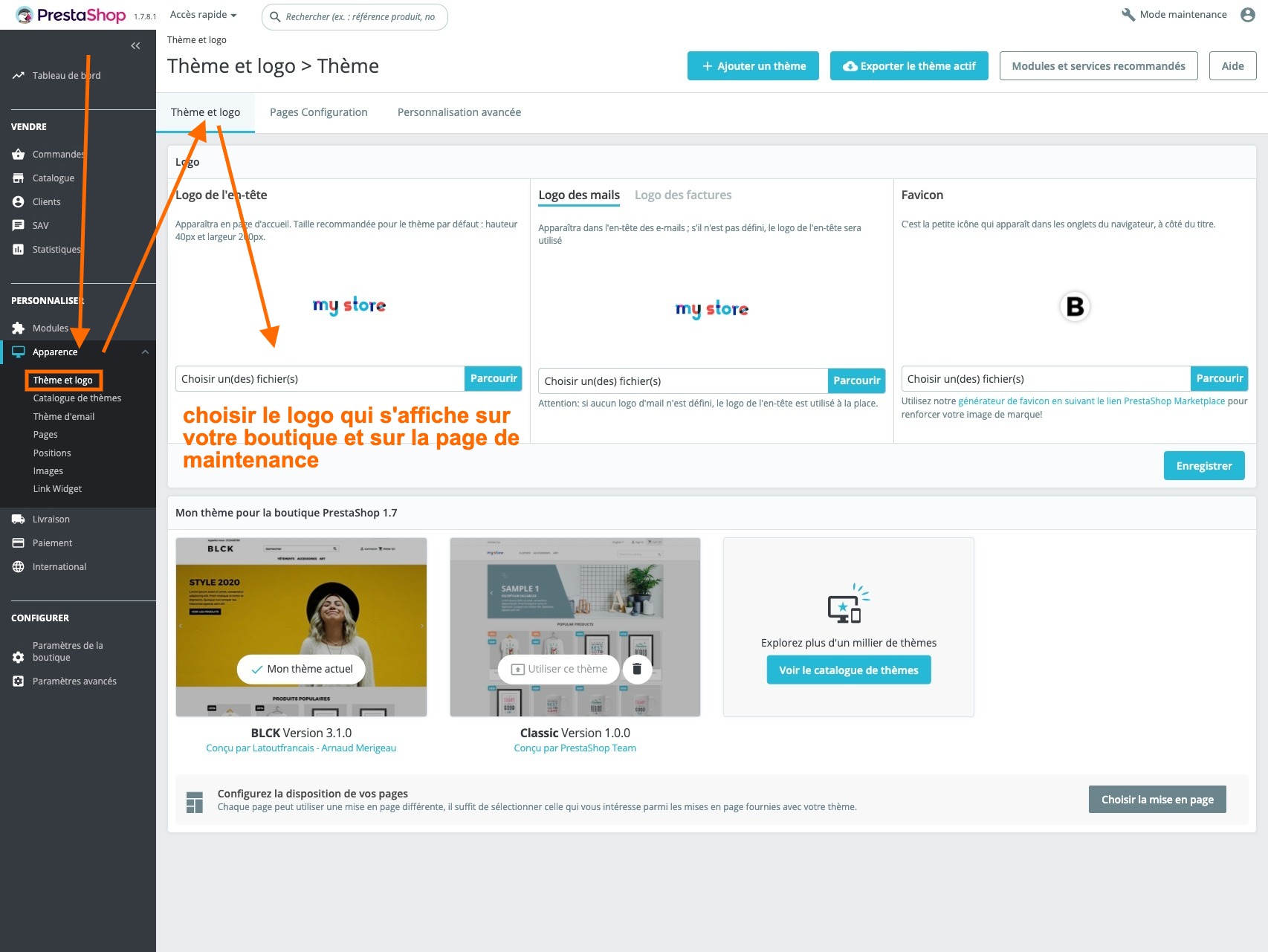 Voici comment changer le logo de la page maintenance de PrestaShopDans le bloc « Logo », vous pouvez uploader une image qui s’affichera par défaut sur la boutique activée et sur la page de maintenance.