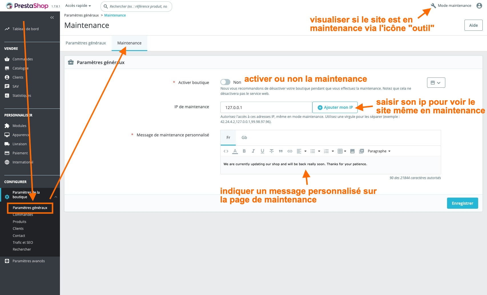Comme pour activer ou désactiver la maintenance de PrestaShop, on va être efficace.