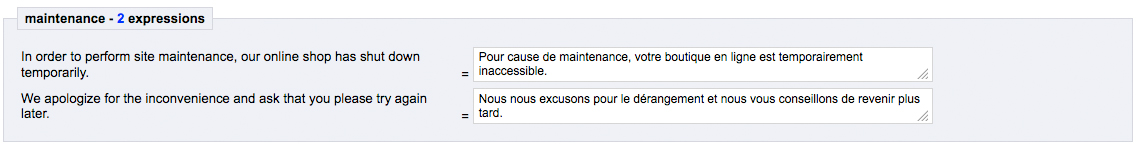 Dans les plus vieilles versions de PrestaShop, on peut personnaliser le message affiché sur la page de maintenance. Pour cela, allez dans le back office > onglet « Outils » puis « Traductions » puis choisissez les traductions front office dans le menu déroulant et la langue en question. Il ne vous reste qu’à trouver les bonnes traductions et de les modifier pour enfin enregistrer le tout (voir capture).