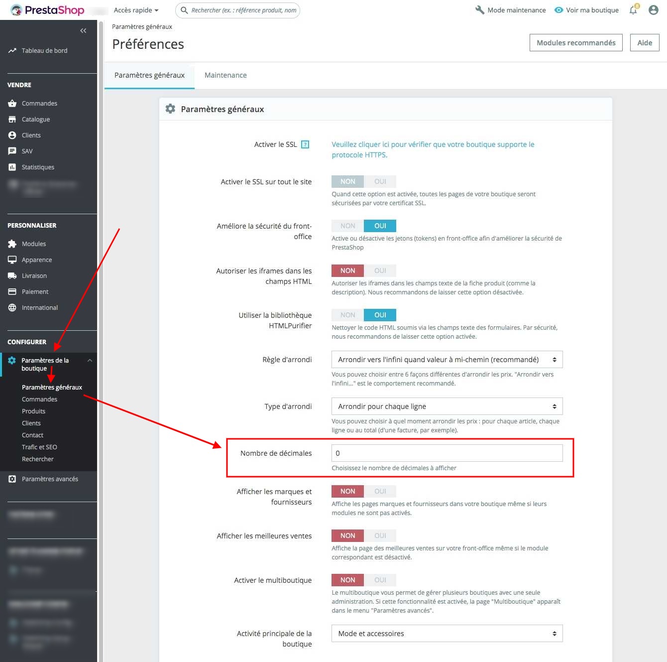 Dans l’admin de PrestaShop, rendez-vous dans Paramètres de la boutique > Paramètres généraux, puis réglez l’option « Nombre de décimales » à zéro.