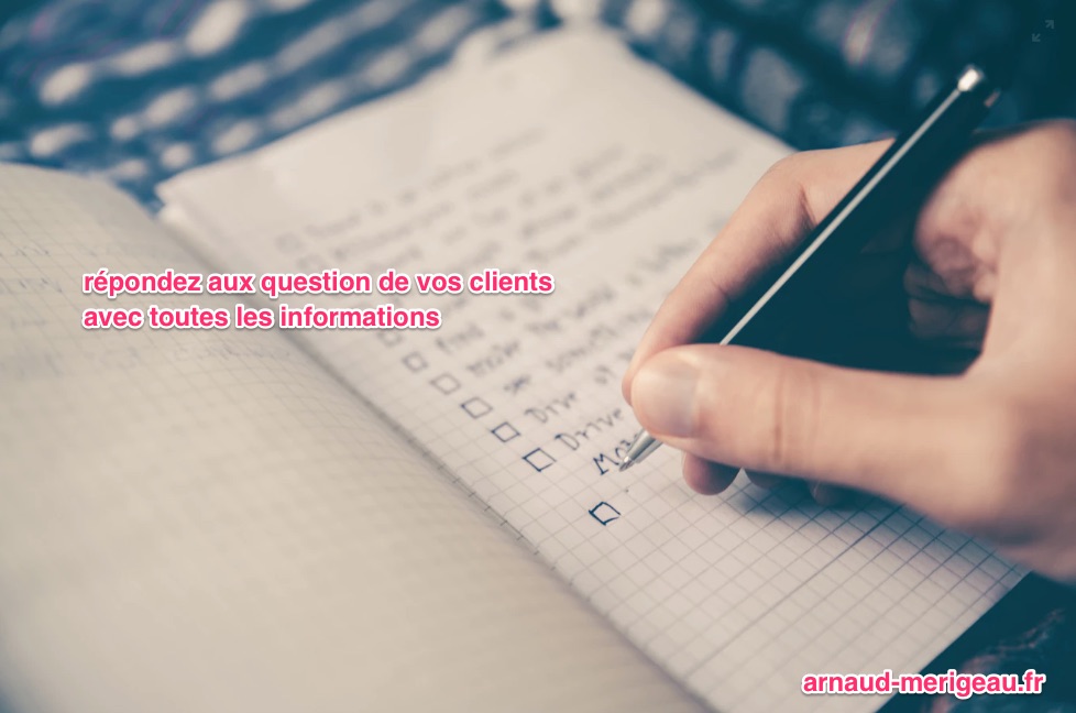 RÉPONDEZ aux questions de vos clients ! Insérez les réponses dans vos fiches produits, dans une FAQ, dans la page qui-sommes-nous ou la page contact.