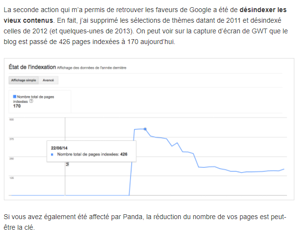 Dans mon cas, j’ai amélioré la note globale de mon blog (reussir-mon-ecommerce.fr) en supprimant plus de 170 articles que je jugeais de faible qualité.