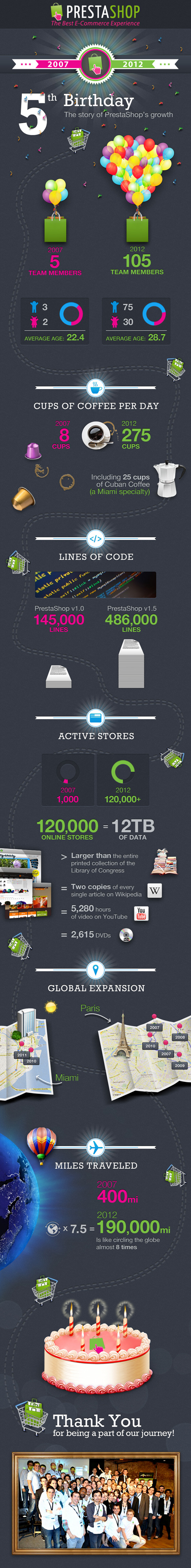 Le 10 mai 2007 exactement, le CMS PrestaShop ouvrait son code et ses portes au monde entier. Aujourd’hui pour le 5ème anniversaire, on dénombre plus de 120 000 boutiques en ligne à travers le monde !