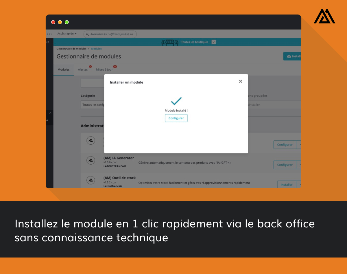 L’installation du module AM LLM pour PrestaShop est plug & play. Il vous suffit d’ajouter le module via le back office ou via FTP. Possibilité de déléguer l’installation via un ticket d’installation de module également.
