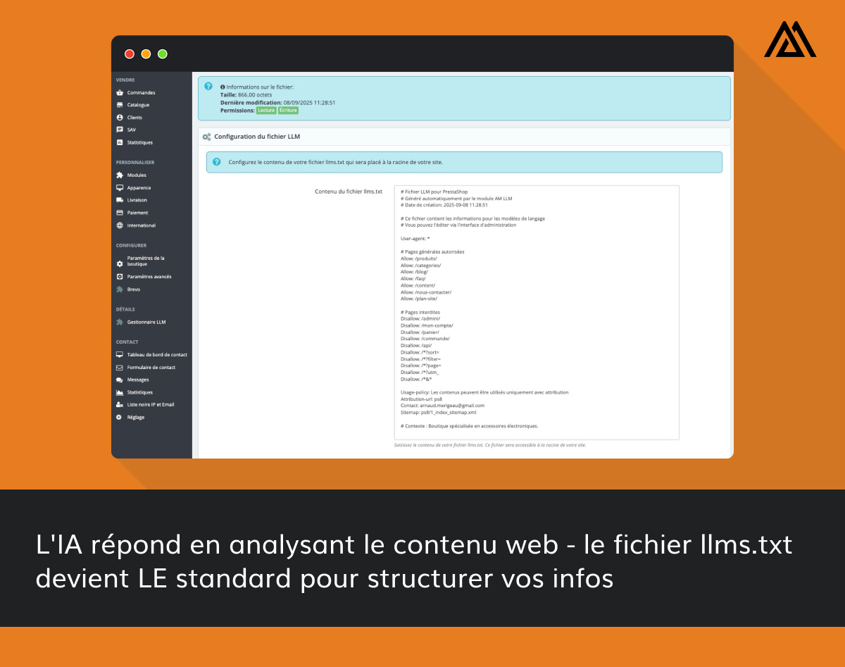Le module génère un fichier llms.txt que l’IA peut utiliser immédiatement car il contient toutes vos informations structurées selon les meilleures pratiques.