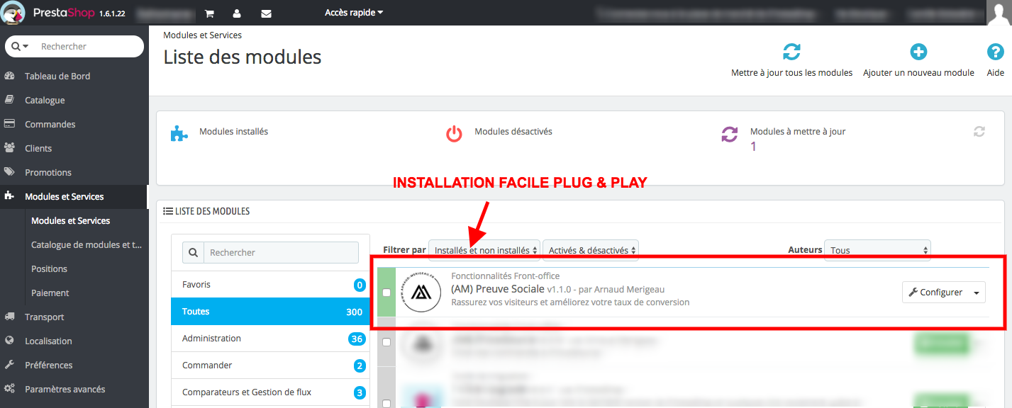 L’installation du module Preuve Sociale pour PrestaShop est plug & play. Il vous suffit d’ajouter le module via le back office ou via FTP. Possibilité de déléguer l’installation via un ticket d’installation de module également.