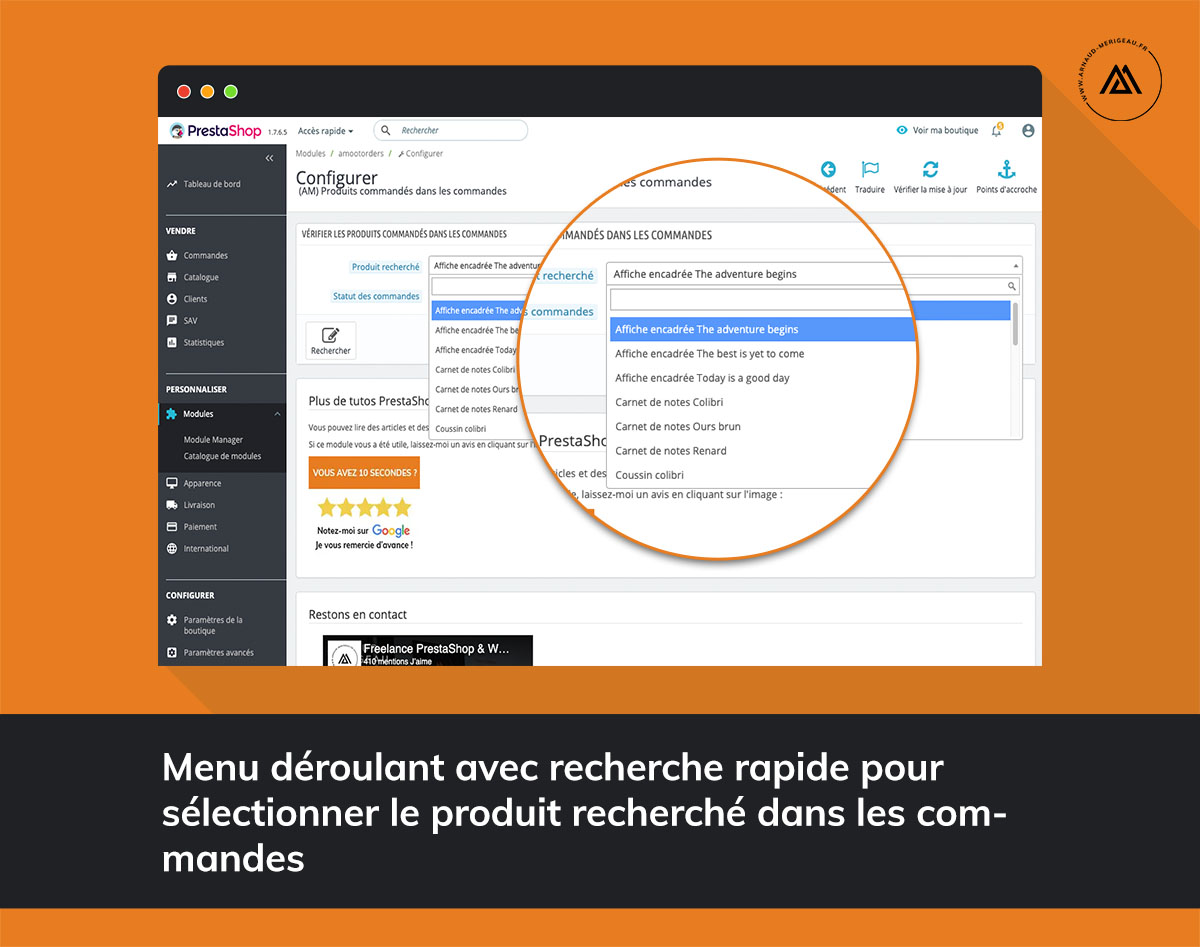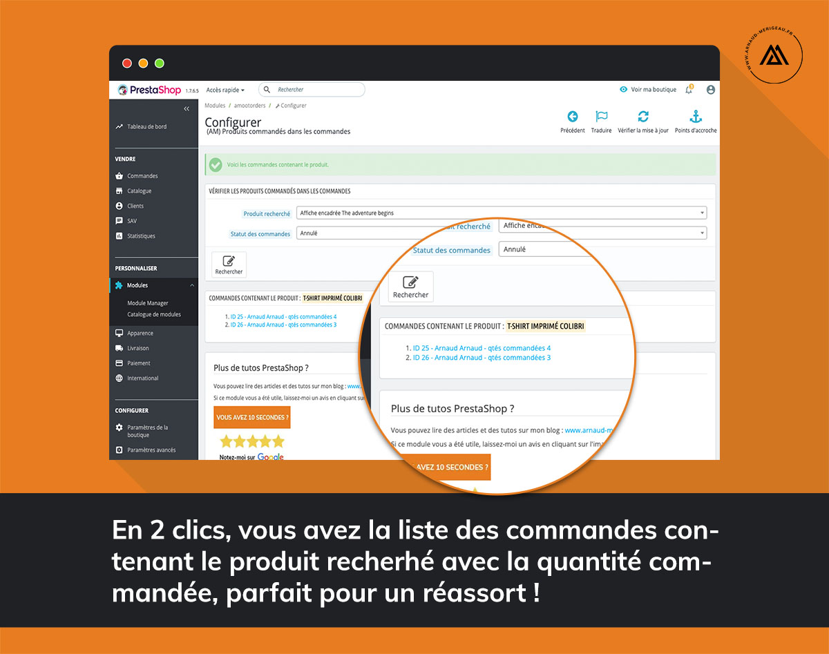 Vous pouvez donc via le module recherche produits par commande pour PrestaShop :