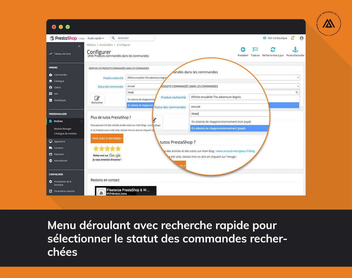 Le module Module recherche produits par commande pour PrestaShop vous permet de gérer vos commandes rapidement et simplement notamment si vous avez des commandes en réapprovisionnement.