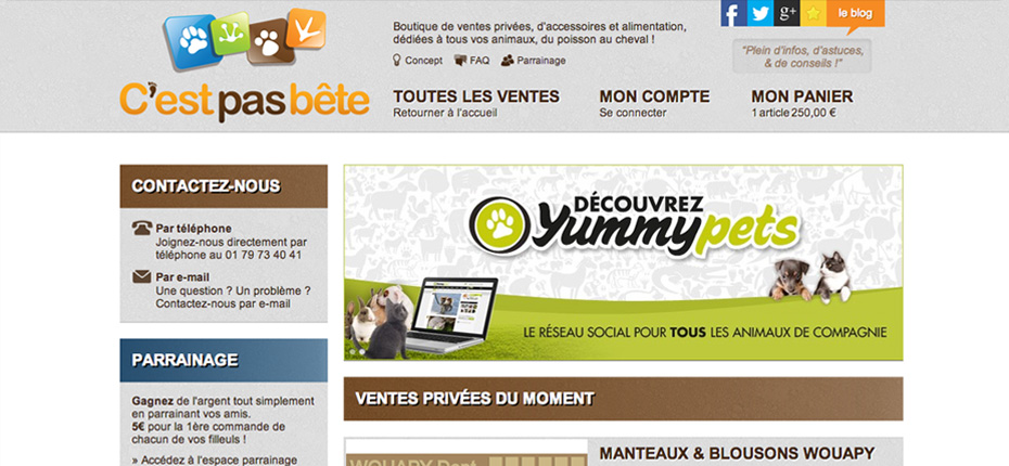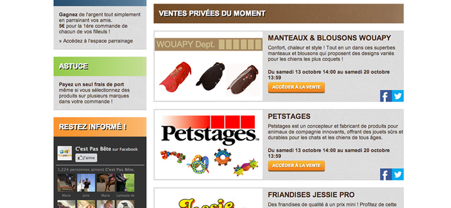 Création de la boutique de ventes privées d’accessoires et alimentation pour animaux C’est pas bête : suivi du projet, recherche ergonomique, création graphique, intégration et paramétrage.